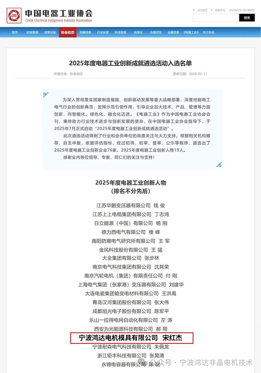 近日,由《电器工业》杂志在中国电器工业协会指导下组织的“2025年度电器工业创新成就遴选活动”结果正式揭晓。宁波鸿达电机模具有限公司创始人、董事长宋红杰先生,凭借其在非晶电机铁心领域取得的颠覆性技术突破与产业化贡献,荣膺“2025年度电器工业创新人物”称号。此项荣誉不仅是对宋红杰先生在电机行业深耕与创新引领的肯定,更是对宁波鸿达在解决非晶电机产业化世界性行业难题、推动电机产业能效革命中所做卓越贡献的高度认可。 ![]() 深耕行业近四十载,奠基创新基石 宋红杰董事长自1988年创立宁波鸿达以来,始终专注于电机铁心核心技术的研发与制造。在宋红杰董事长的引领下,宁波鸿达形成了深厚而连续的技术积淀:38年的精密模具技术、24年的自粘结电机铁心技术,以及11年的非晶铁心技术研发。这些长期、专注且层层递进的技术积累,相互融合与支撑,共同为公司实现今日的颠覆性创新构筑了坚实而深厚的根基。深厚的技术积淀与产业化成果,最终凝结为行业的共同规范。宁波鸿达积极承担行业责任,主导并参与了多项关键标准的制定:中国自粘结铁心标准第一起草单位(T/CEEIA 942-2025),电机铁心模具第一起草单位(JB/T 11904-2014,T/ZZB 3018-2022),以及《非晶合金复合带材技术规范》与《自粘结非晶电机铁心技术规范》。