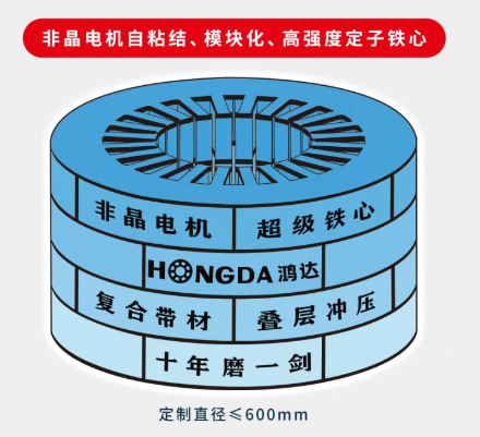 攻克66年世界难题,实现非晶电机产业化突破 传统硅钢电机因材料性能限制,效率提升已接近瓶颈,而更高性能的非晶电机虽前景广阔,但产业化进程却长期受制于铁心制造这一核心难题。面对这一世界性挑战,宋红杰董事长以战略眼光毅然投入研发,带领团队“十年磨一剑”,宁波鸿达连续攻克非晶带材多层复合、自粘结涂层、皮带涨紧剪切、铁心快速打样,精密模具、多层冲压、叠装固化、自粘结电机铁心检测等关键核心技术。非晶电机自粘结铁心,历经实验室、小试、中试全流程验证,已实现工程化、产业化量产,成功解决了困扰非晶电机产业化66年的世界性难题!